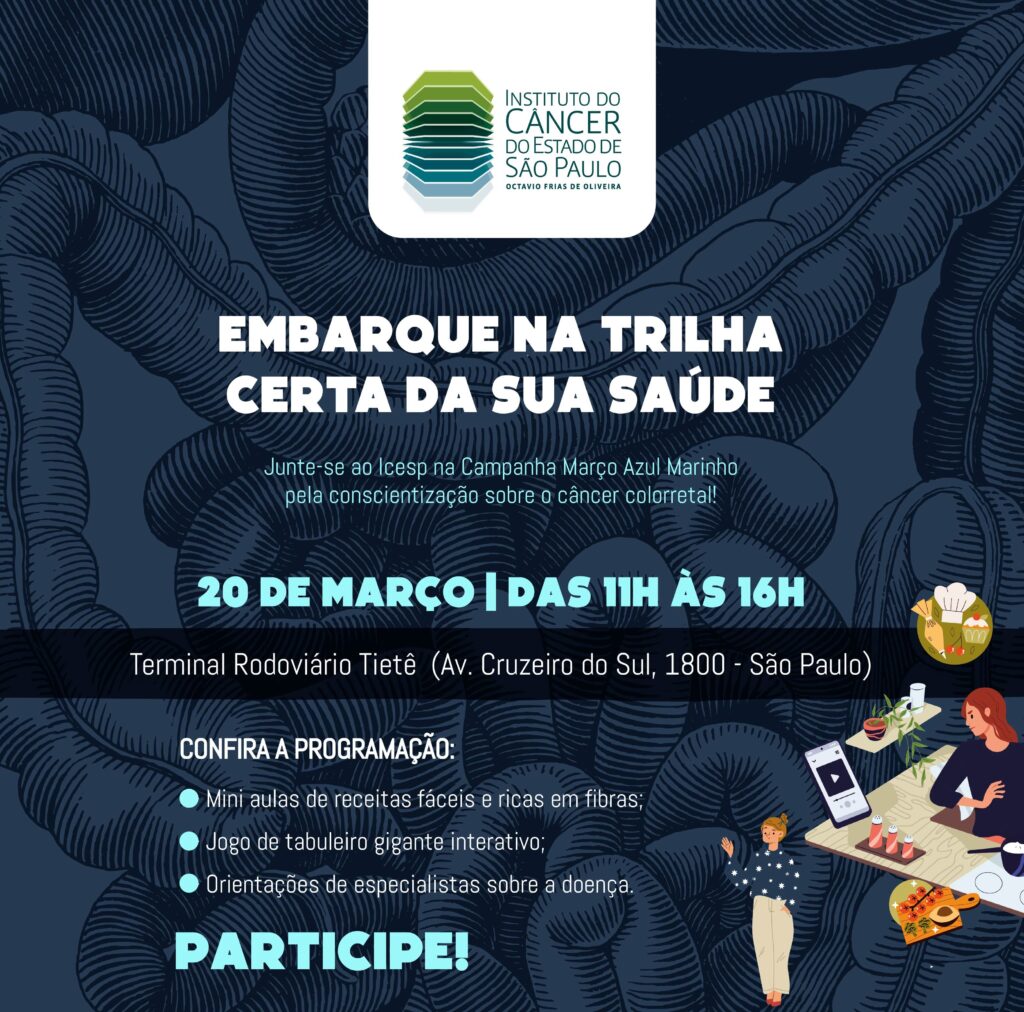 Em alusão à campanha Março Azul Marinho, o Icesp promove no dia 20 de março, uma ação especial de conscientização sobre o câncer colorretal, no Terminal Rodoviário do Tietê, das 11h às 16h.