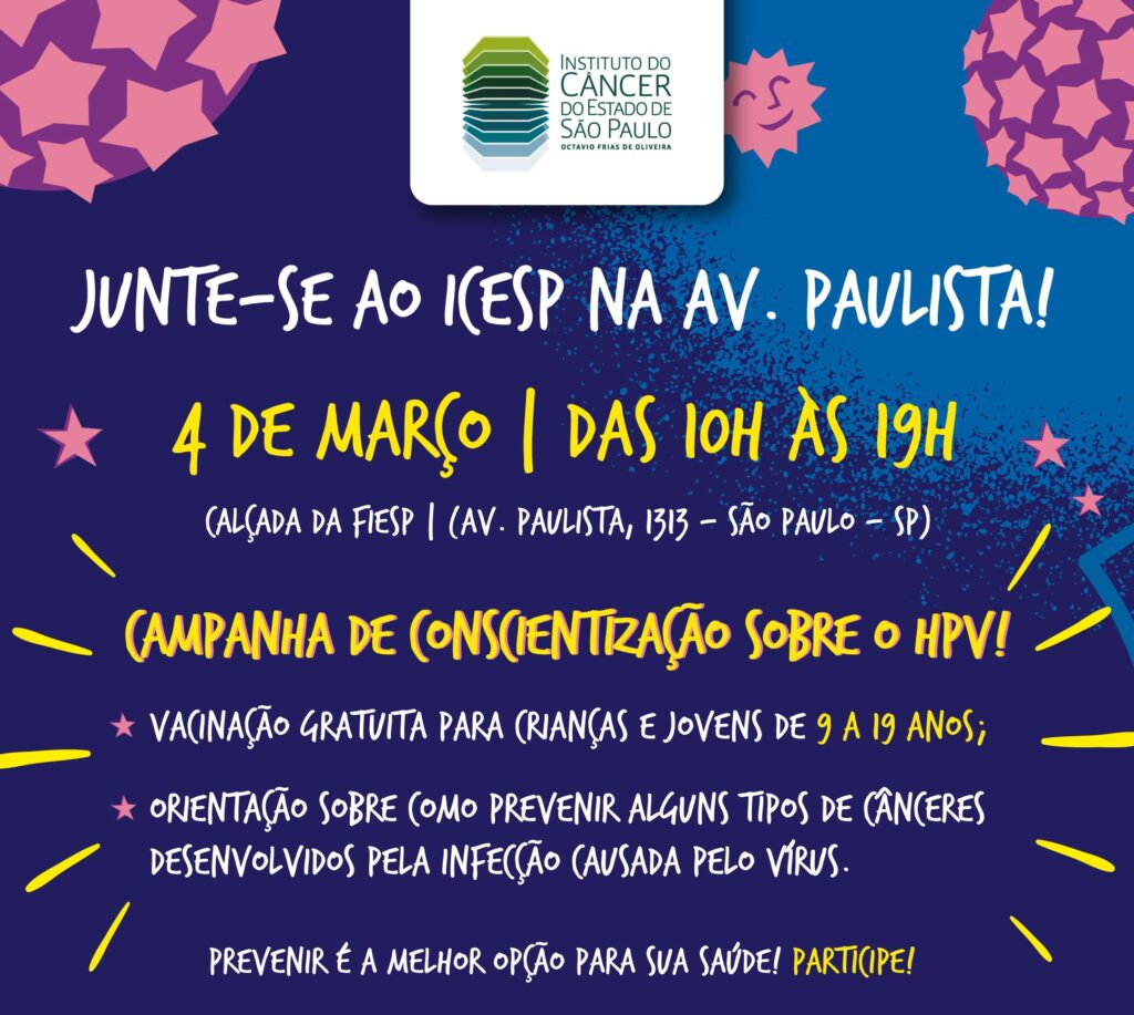 No dia 4 de março, das 10h às 19h, especialistas do Instituto e de instituições parceiras estarão na Av. Paulista, na calçada do prédio da Fiesp – Federação das Indústrias do Estado de São Paulo, com informações e orientações importantes sobre o Papilomavírus Humano (HPV), que está associado ao desenvolvimento de diferentes tipos de cânceres, como colo do útero, vagina, vulva, ânus, pênis e orofaringe